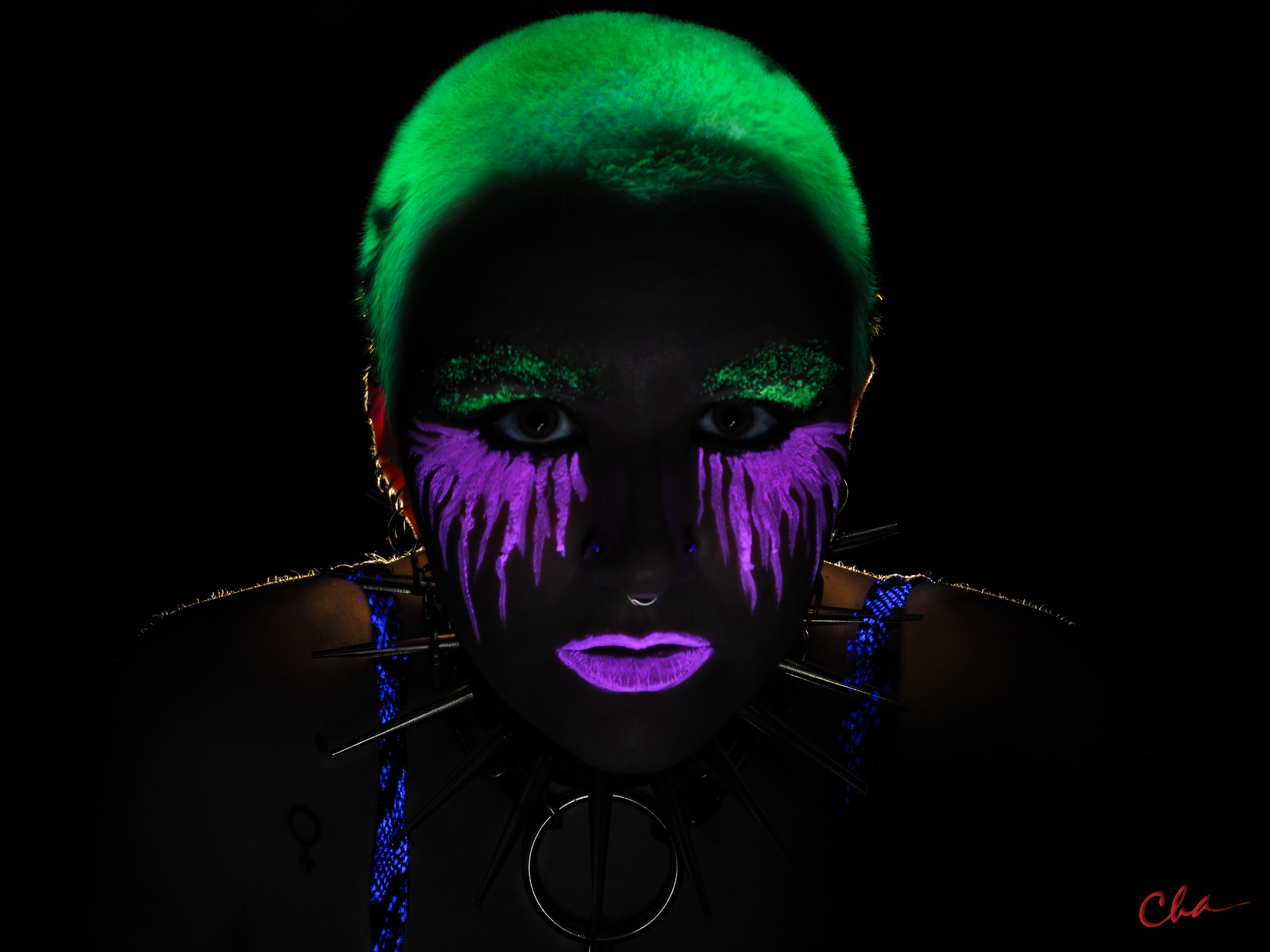 I use a sewing machine for making costumes made of fabrics that reflect, diffuse or glow with ultraviolet light. A powerful black light projector helps me for my UV body painting and stop motion choreographies.