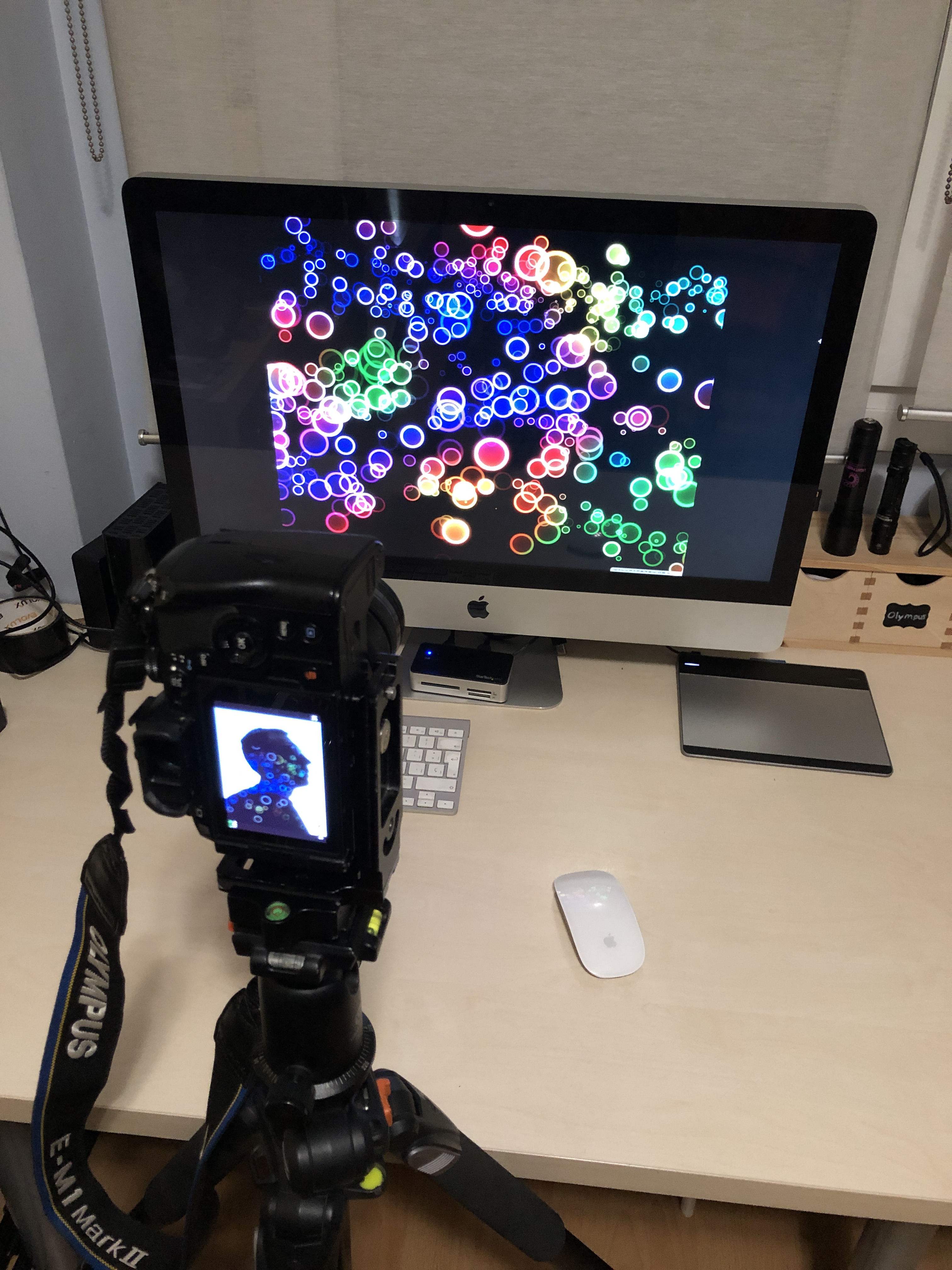 Afterwards he put a lens cap on the lens and changed to a second tripod which he had set up in advanced, pointing at his computer screen which was filled with an image of bubbles.  At this point, we quickly remove the lens cap, leave the camera to expose the image for a few seconds and then stop the exposure.