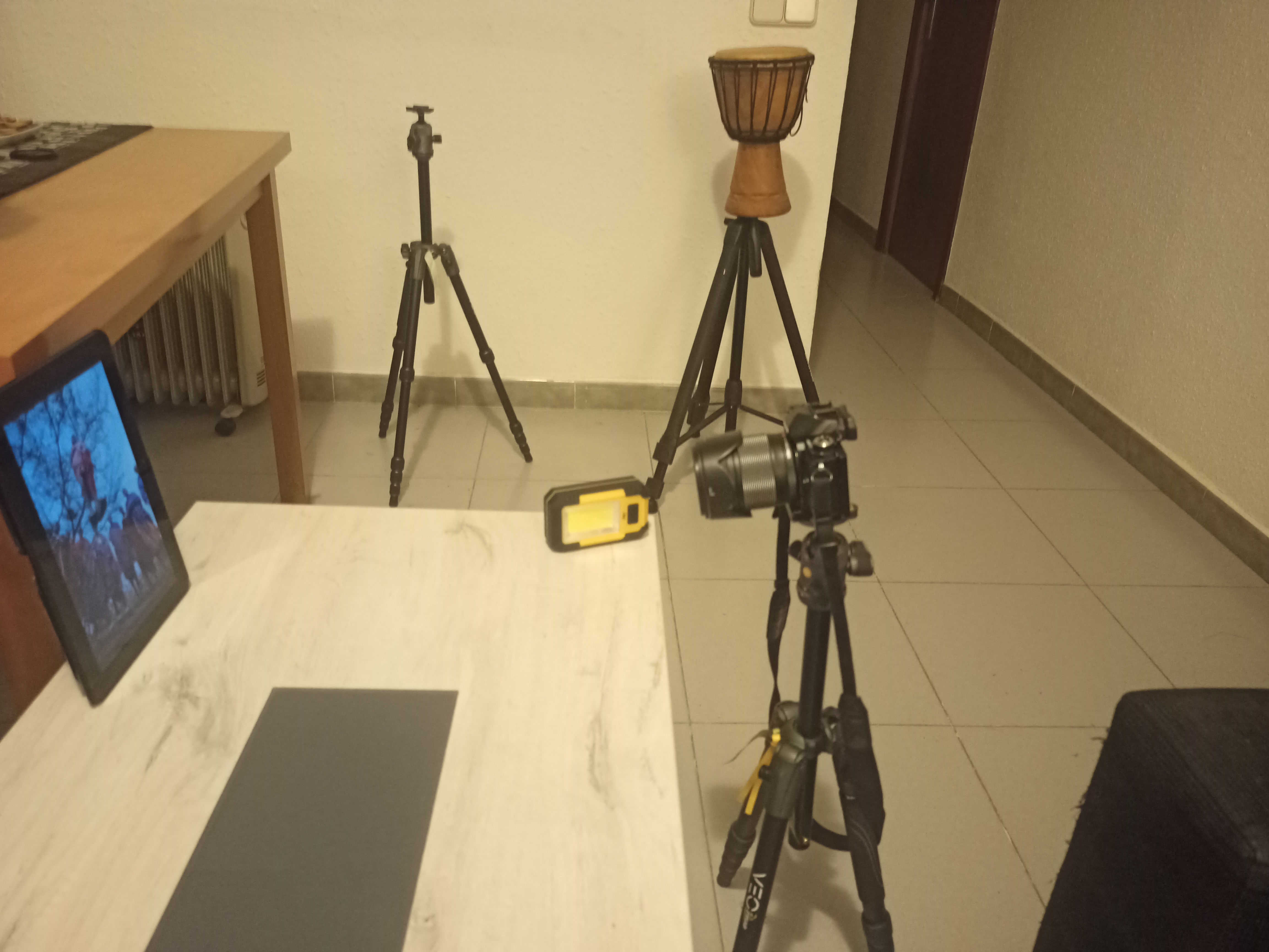We cover the lens in the same way we did for the previous photo and we change tripod to a second tripod which is already set up and focused on a tablet, on which we have a previously selected image.  At this point we uncover the lens, check the exposure on the back of the camera and stop the exposure when we are happy with it.