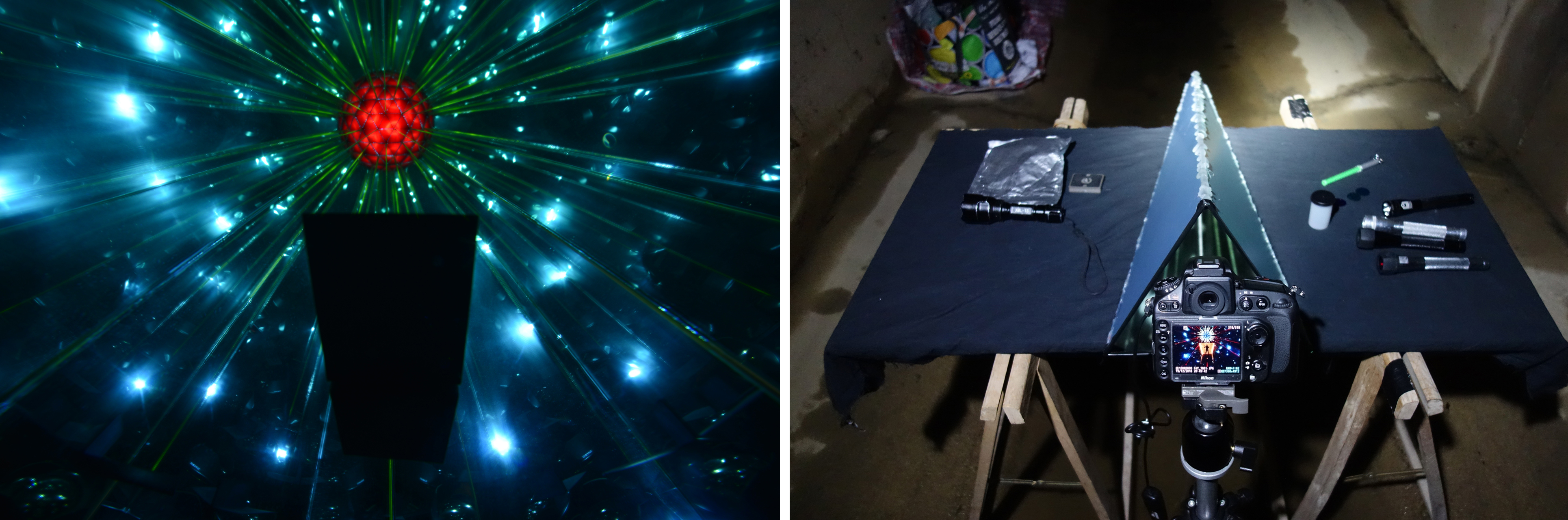 He utilizado dos trípodes y dos objetivos manuales distintos (un 14mm Samyang y un 24mm Nikon), un kaleidoscopio y lana de acero. Por supuesto, durante el shooting, cambié de enfoques y de diafragma.